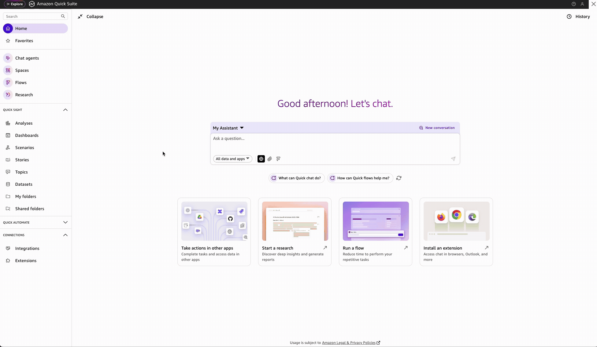 Amazon Quick Suite is an AI-powered suite for enterprise answers your questions and turns those answers into actions using agentic teammates for research, business insights, and automation.